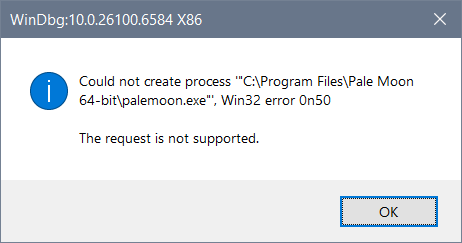 I uninstalled the initial 32-bit WinDBG, and the x64 one from Debugging Tools. Then installed again from the x64 Debugging Tools (https://download.microsoft.com/download ... _en-us.msi) and searched for WinDBG in start menu. It's there, and the right bit version, and I ran Pale Moon with it without problems.